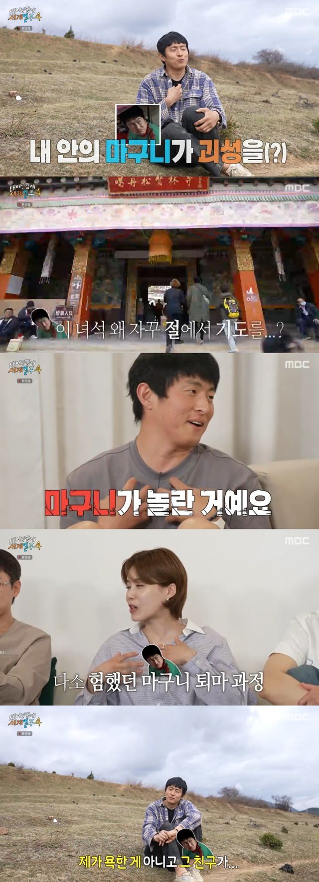 기안84는 "성스러운 곳에 오니까 마구니가 놀란 거다"라고 말했고, 장도연은 "오체투지 전에 마구니를 뱉어냈다"라고 거들었다.