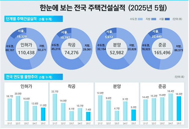 그러나 서울 주택의 착공, 분양은 감소세를 이어갔다. 전국 주택 착공 건수는 5월 누적 7만 4276가구로 전년동기대비 30.3% 줄었다. 서울 역시 1만 787가구가 착공해 11.1% 감소했다. 특히 서울 아파트는 8850가구만 착공돼 15.2% 감소세를 보였다.