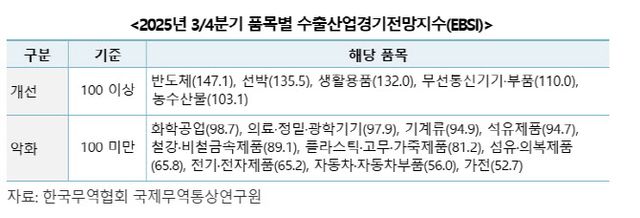 반면 고성능 AI 반도체 수요 지속 및 3분기 D램 가격상승이 전망된 반도체(147.1)를 비롯해 LNG선 등 고부가 선박 수출 확대와 수출단가 상승에 힘입은 선박(135.5)은 호조세를 지속할 것으로 조사됐다.