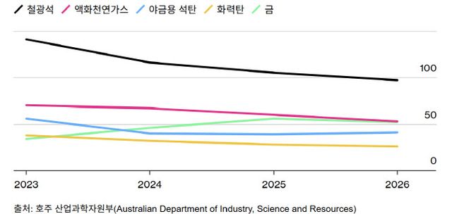 호주의 최대 수출 품목인 철광석은 전체 수출 수익의 약 30%로 여전히 가장 큰 수입원이다. 출하량은 증가하지만, 가격과 등급 하락으로 2026!2027년에는 철광석 수익이 10년 만에 처음으로 1000억 호주달러 아래로 떨어질 것으로 예측됐다.