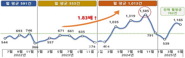 2022년에는 월 평균 591건에 불과했던 개인형 이동장치 관련 민원은 2023년 월 평균 553건으로 늘었고 지난해엔 월 평균 1013건까지 치솟앗다. 올해 역시 월 평균 762건의 민원이 들어오고 있다.