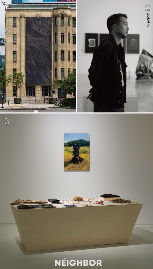 1 지용킴, ‘<시대복장> 옥외 현수막’, Sun-bleached, fabric, 1546×591cm. 2 지용킴의 김지용 디렉터. 3 (위) ‘필드 테스트’, 2025, Archival print, 84×59cm. (아래) ‘재료들’, 2025, Mixed media, 100×220×72cm.