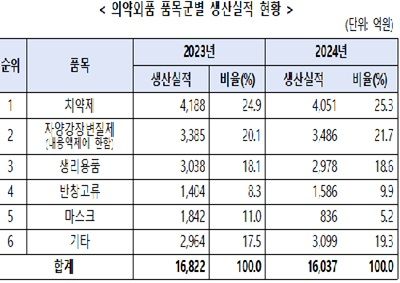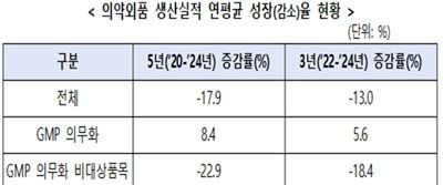 의약외품 제조·품질관리기준(GMP) 적용이 의무화된 업종의 2024년 생산실적은 4,846억원으로 전년 대비 6.6% 성장해 의약외품 산업 성장 동력 역할을 했다. GMP 의무화 제형은 내용고형제, 내용액제, 외피용연고제, 카타플라스마제 등이다.