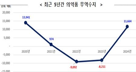 2024년 의약품 수출실적은 전년(9조 8,851억원) 대비 28.2% 급증한 12조 6,749억원으로 최근 5년간 최고치를 기록했다.