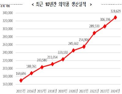 2024년 의약품 생산실적 32조 8,629억원은 1998년 관련 통계 집계 이후 역대 최고치다. 이는 국내총생산(GDP) 대비 1.29%, 전체 제조업 분야 GDP 대비 4.80% 수준이다.