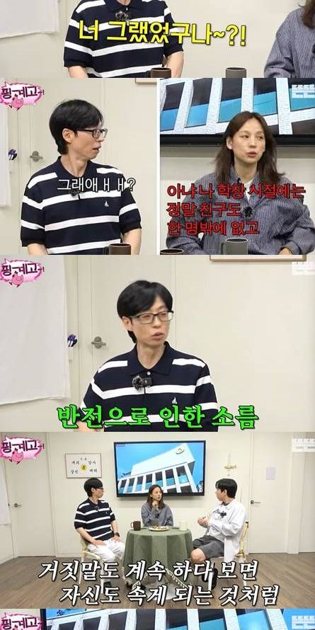이효리는 "아니다. 학창 시절에는 정말 친구도 한 명밖에 없고 말도 잘 안 했다. 춤 노래를 좋아하긴 했는데 누구한테 솔직하게 내 얘기를 하거나 그런 성격은 아니었다"라고 설명했다.