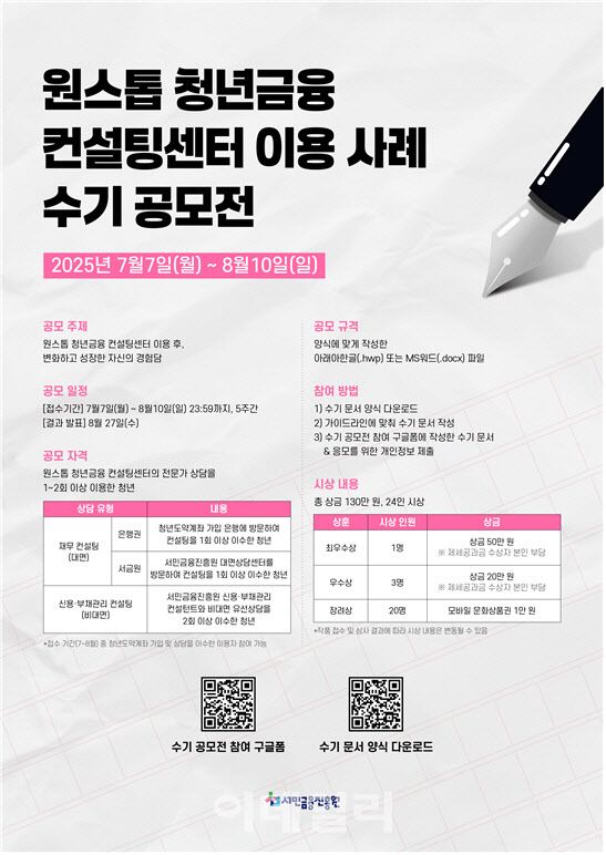 아울러 서금원은 원스톱 청년금융 컨설팅센터 전문가 상담을 이용한 청년을 대상을 내달 7일부터 8월 10일까지 ‘원스톱 청년 금융 컨설팅센터 이용 수기 공모전’을 개최한다.