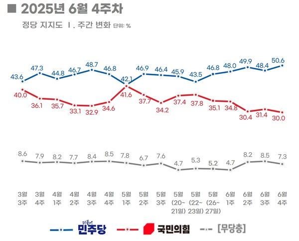 [폴리뉴스 김승훈 기자] 더불어민주당 정당 지지율이 50.6%를 기록하며 작년 12월 3주차(50.3%) 이후 약 6개월 만에 50%대로 올라섰다는 여론조사 결과가 나왔다. 반면, 국민의힘은 직전 조사보다 하락(1.4%P)하며 양당 간 격차는 17.0%P에서 20.6%P로 벌어졌다.