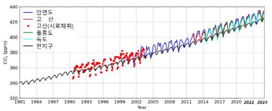 국립기상과학원은 30일 ‘2024 지구대기감시보고서’를 발간하면서 2024년 한반도 이산화탄소 배경농도가 관측 이래 최고치를 기록했다고 발표했다. 보고서에 따르면, 지난해 우리나라의 이산화탄소 배경농도는 안면도에서 430.7ppm, 고산과 울릉도에서 각각 429.0ppm과 428.0ppm을 기록하면서 3개 지점 모두 최고치를 경신했다.