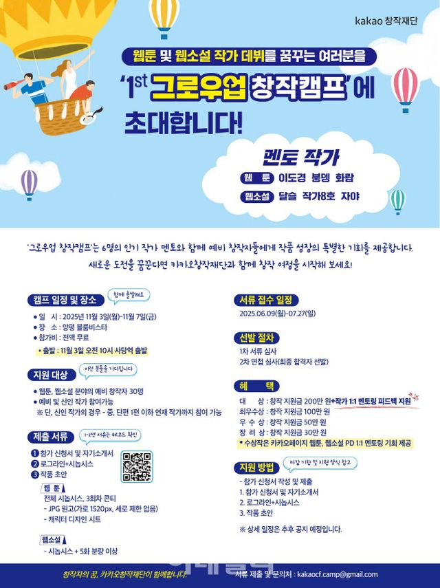 예비 창작자를 위한 정기 강연 ‘그로우업 톡앤톡’에 이은 실전형 과정이다. 카카오창작재단은 작품 집필부터 데뷔까지 이어지는 창작자 성장의 전 과정을 단계적으로 지원할 수 있는 체계를 갖추고 이를 지속해 나간다는 방침이다.
