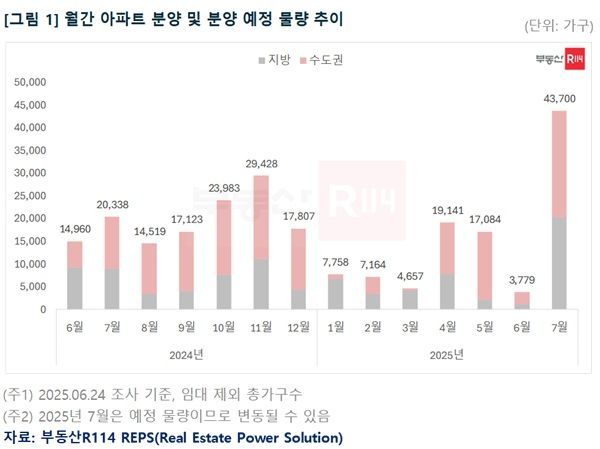 30일 부동산R114에 따르면, 임대를 제외한 7월 전국 아파트 분양 예정 물량은 4만3700가구로 수도권 2만3420가구, 지방 2만280가구가 각각 분양에 나선다. 6월(3779가구)과 비교하면 1056% 증가한 규모다.