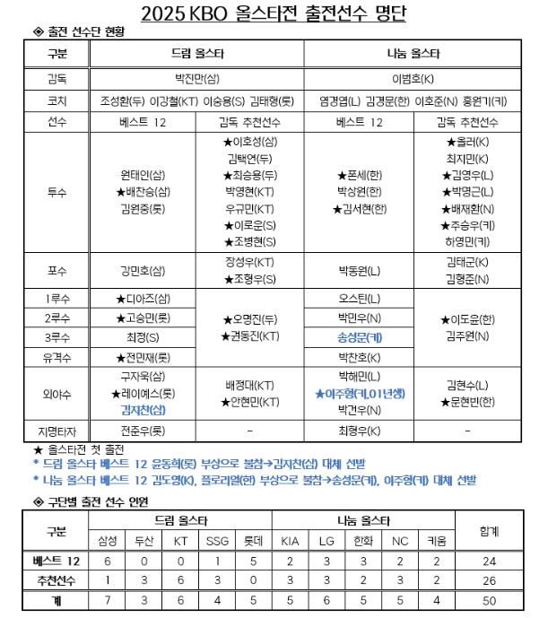 KBO는 ‘전체 50명의 선수 중 절반에 가까운 23명의 선수가 처음으로 올스타전에 출전한다’라고 부연하기도 했다. 올해 KBO리그 올스타전은 다음 달 12일 신축 구장인 대전 한화생명 볼파크에서 열린다.