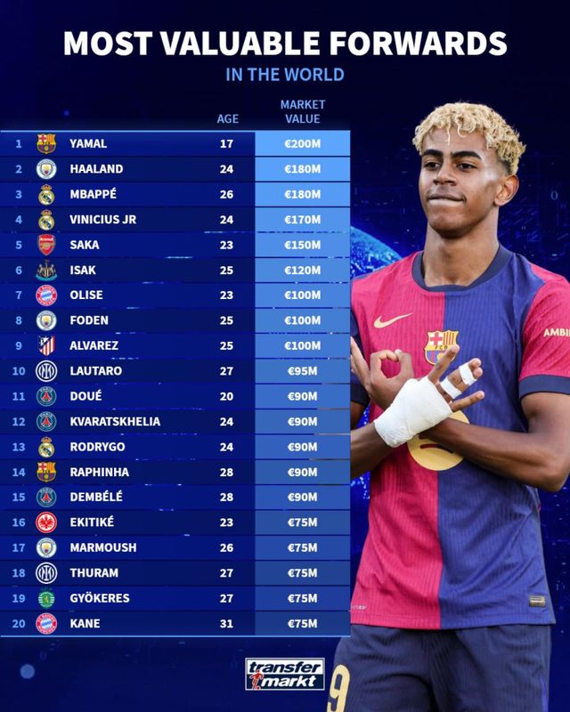 한편 종전까지 공격수 부문 시장 가치 1,2위를 다투던 건 음바페와 엘링 홀란(맨체스터 시티)이었다. 두 선수의 시장가치는 1억 8000만 유로(약 2850억원)로 평가받지만, 야말에게 미치지 못한다.