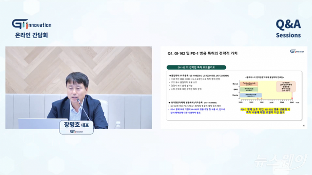 장명호 지아이이노베이션 대표가 30일 열린 간담회에서 GI-102 및 PD-1 병용 특허의 전략적 가치에 대해 설명하고 있다. 자료=지아이이노베이션 공식 유튜브 캡처