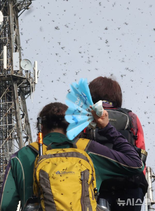 소셜 미디어에 공유된 영상에는 인천 계양산의 하이킹 코스와 전망대가 곤충으로 인해 검은색 카펫이 덮여있는 듯한 모습이 담겨 있다고 신문은 전했다.
