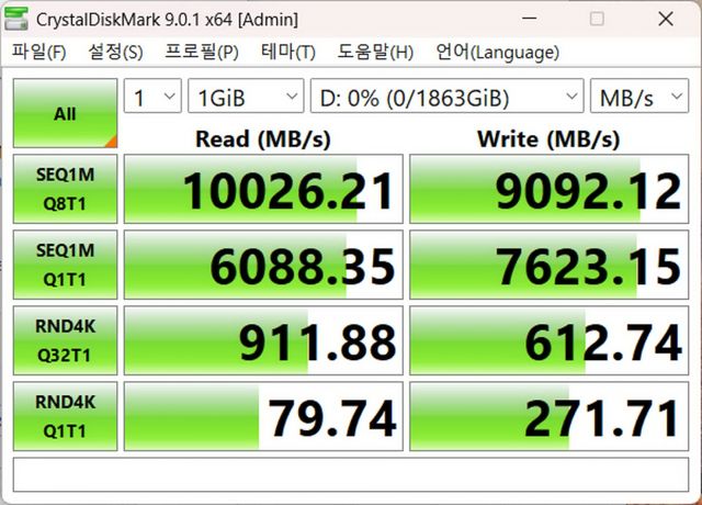 | 순차 읽기 / 쓰기 | 7.1 / 6.0 GB/s | 10.0 / 8.7 GB/s |