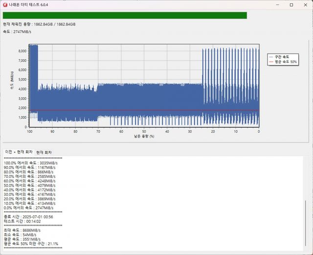 이전 제품과 동일하게 DRAM-less 설계를 택했지만, 세대가 다르니 체감은 확연히 달라졌다. 호스트 메모리 버퍼(HMB)에 의존하는 구조는 동일해도, E31T 컨트롤러와 276-레이어 TLC 낸드가 결합하면서 대용량 캐시 영역이 확장됐고, 캐시 소진 이후 쓰기 저하 구간 역시 짧아졌다. 덕분에 수백 GB에 달하는 생성형 AI 학습 데이터셋을 로컬 로드할 때도 속도가 급락하거나 지연되는 구간이 눈에 띄게 줄어들었다.