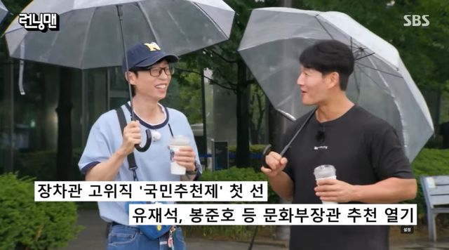 29일 방송된 SBS '런닝맨'에서 유재석이 '문체부 장관'에 추천받은 사실이 공개되며 화제를 모았다. 앞서 유재석은 이재명 대통령을 필두로한 정부가 시행 중인 '국민추천제'에서 문화체육관광부 장관 후보로 거론된 바 있다. 당시 유재석을 비롯해 봉준호 감독, 아이유 등도 함께 후보에 올랐다.