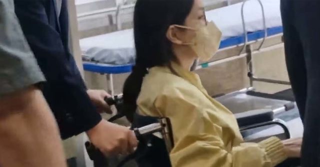 휠체어를 탄 김건희 여사. 휠체어를 미는 사람은 윤석열 전 대통령이다. / KBS