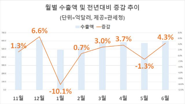 6월 기준 역대 최대 수출실적이다. 한국 수출은 올 3월부터 시작된 미국 트럼프 정부의 고관세 정책 여파로 5월 수출이 전년대비 1.3% 감소하는 등 어려움을 맞았으나 한 달 만에 다시 전년대비 증가 전환했다.