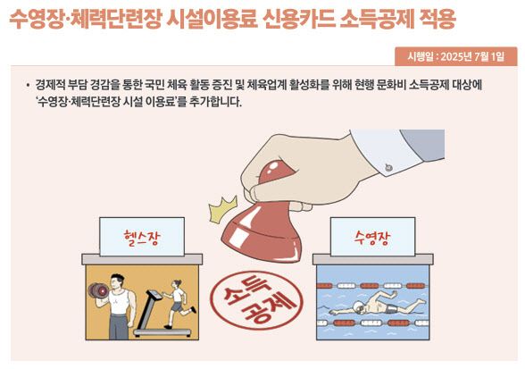 기획재정부·문화체육관광부는 이날부터 수영장·체력단련장 등 체육시설 이용에 대한 부담을 완화하기 위해 시설이용료에 대해 소득공제를 시행한다. 기존에 도서 구입, 공연 티켓, 미술관 입장료, 신문 구독료 등 문화 분야에 주로 적용되던 문화비 소득공제 제도는 지난해 정부의 세법 개정으로 헬스장·수영장에도 적용되게 됐다. 다만 총급여가 7000만원 이하인 근로소득자만 소득공제를 받을 수 있다.