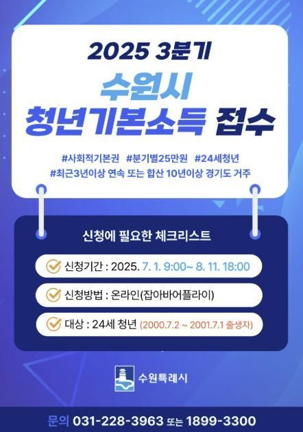 [와이뉴스] 수원시가 7월 1일 오전 9시부터 8월 11일 오후 6시까지 24세 청년을 대상으로 ‘2025년 3분기 청년기본소득’ 신청을 받는다.