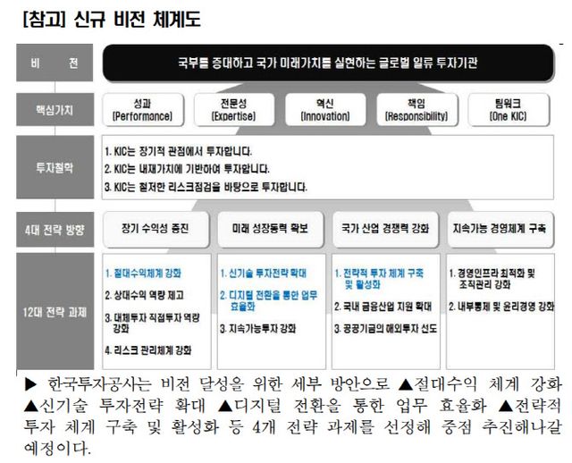 또한 혁신을 통해 지속적 성장을 추진하고 운용성과와 역량, 거버넌스, 리스크관리 및 조직문화 등 모든 부문에서 세계 최고 수준을 지향하는 선도적 투자기관으로 도약하겠다는 방향을 밝혔다.