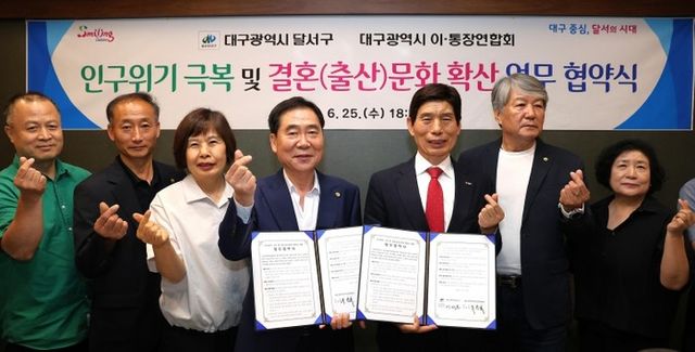 이태훈 달서구청장은 “주민들과 직접 소통하고 연결고리 역할을 하는 이․통장연합회와 ‘잘 만나보세, 뉴(New) 새마을운동’을 통해 초저출생이라는 국가적 위기 극복에 협력하게 되어 매우 뜻깊다”며 “앞으로도 긍정적인 결혼·출산 친화적 문화가 전국으로 확산될 수 있도록 노력하겠다”고 밝혔다.