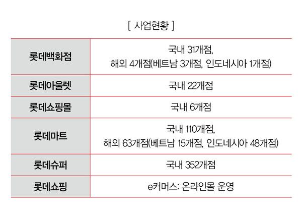 백화점 사업부문은 롯데쇼핑 백화점 및 해외백화점 별도법인, 할인점 사업부문은 롯데쇼핑 할인점 및 해외할인점 별도법인, 전자제품전문점은 롯데하이마트, 슈퍼 사업부문은 롯데쇼핑 슈퍼 및 씨에스유통, 홈쇼핑 사업부문은 우리홈쇼핑, 영화상영업 사업부문은 롯데컬처웍스, 이커머스 사업부문은 롯데쇼핑 이커머스, 기타 사업부문은 롯데위탁관리부동산투자회사 등으로 구성되어 있다.