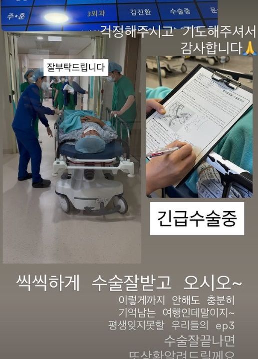또 다른 사진에는 수술 동의서에 서명하는 모습과 "긴급 수술 중"이라는 문구가 담겨 긴박함을 전했다.