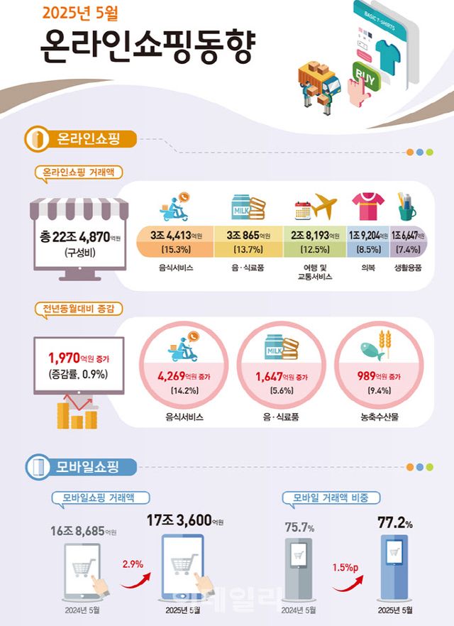 1일 통계청이 발표한 ‘온라인쇼핑동향’을 보면 지난 5월 온라인쇼핑 총 거래액은 22조 4870억원으로 전년 같은 달보다 0.9% 증가하는 데 그쳤다. 전달과 비교하면 3.4% 늘었다.