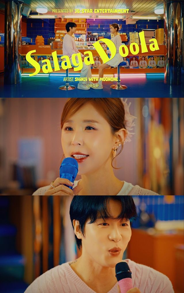 신지는 지난달 30일 오후 6시 공식 SNS 채널을 통해 발라드 가수 문원과 함께한 신곡 '샬라카둘라(Salagadoola)'의 라이브 클립 영상을 선보였다.