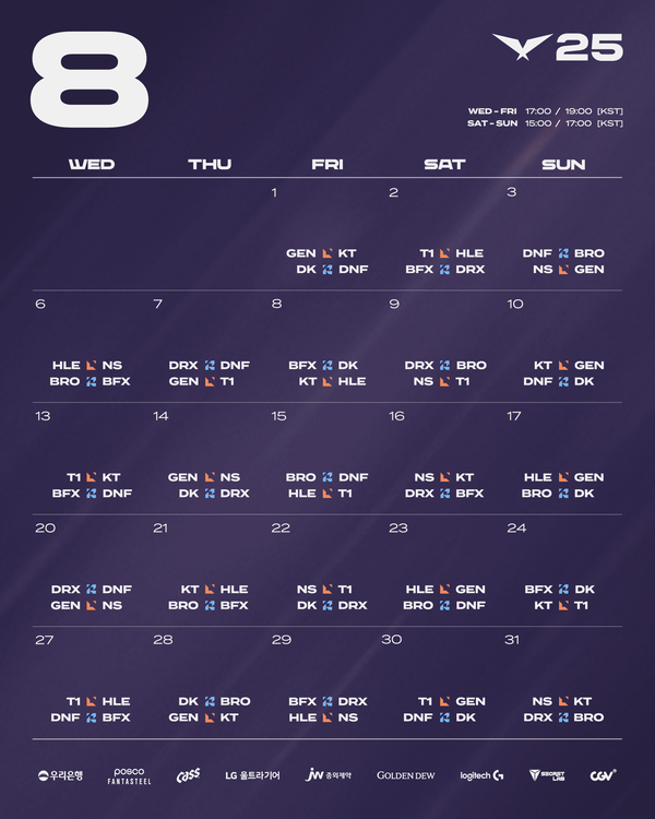 리그 오브 레전드 챔피언스 코리아(이하 LCK)는 오는 23일 2025 LCK 3~5라운드가 라이즈 그룹의 디플러스 기아와 OK저축은행 브리온, 레전드 그룹의 젠지와 한화생명e스포츠의 대결로 막을 올린다고 밝혔다. 9월 28일에는 2025 시즌 최후의 승자를 가리는 최종 결승전이 펼쳐진다.