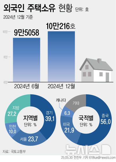 외국인이 소유한 주택의 소재지는 경기도가 3만9144가구(39.1%)로 가장 많고 서울시는 2만3741가구(23.7%), 인천은 9983가구(10.0%) 순으로 나타났다.