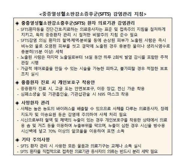 질병청은 SFTS 환자의 혈액·체액에 직접 노출된 의료진과 장례지도사, 간접적으로 혈액·체액에 노출 위험성이 있는 시·공간적 노출자(의료진, 가족)를 대상으로 최대잠복기(14일)의 2배인 28일 동안 증상 발생을 추적관찰 중이다.