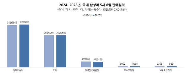 1일 현대차(005380)·기아(000270)·KG모빌리티(003620)(KGM)·제너럴모터스(GM) 한국사업장·르노코리아에 따르면 지난달 국내 5개사가 국내외 시장에서 판매한 완성차는 총 69만1507대로 전년 대비 0.2% 증가했다. 기아는 특수차를, KG모빌리티는 현지조립형 반제품(CKD)을 각각 포함한 수치다.