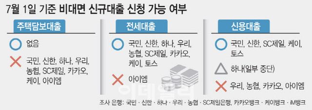 국민·신한·SC제일은행과 케이뱅크, 토스뱅크에서는 신용대출 접수를 할 수 있지만 하나·우리은행에서는 일부 신용대출 상품을 신청할 수 없다. 농협은행과 카카오뱅크, iM뱅크 신용대출 접수도 막힌 상태다. 은행들이 6·27 대책으로 갑작스럽게 바뀐 대출 한도와 담보인정비율(LTV)에 맞춰 아직 전산 시스템을 정비하고 있기 때문이다.