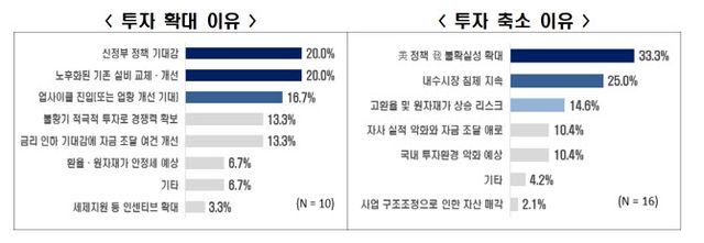 이는 이재명 정부의 경기 부양책에 따른 업황 개선 기대감이 작용한 것으로 풀이된다. 실제 하반기 투자를 확대할 계획이라고 응답한 기업 중 20.0%가 ‘신정부 출범에 따른 정책 변화 기대’를 가장 큰 이유로 꼽았다. ‘노후화된 기존 설비 교체·개선’을 이유로 답한 기업도 20.0%였다. 업사이클 진입 또는 업황 개선 기대를 기론한 기업은 16.7%였다.
