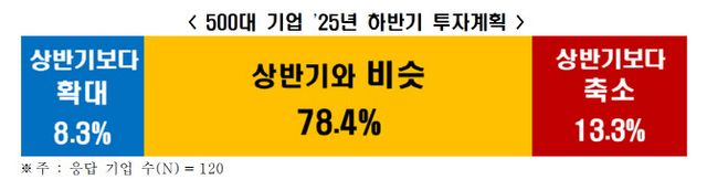 2일 한국경제인협회가 여론조사기관 모노리서치에 의뢰해 매출액 500대 기업을 대상으로 실시한 설문(120개사 응답)을 보면, 응답 기업 중 78.4%는 올해 하반기에 상반기와 비슷한 규모의 투자를 계획 중인 것으로 나타났다. 확대하겠다는 답변은 8.3%였다. 기업 10곳 중 9곳에 가까운 86.7%는 최소한 상반기 수준의 투자 규모는 유지하겠다는 것이다. 투자를 줄이겠다는 응답은 13.3%에 그쳤다.