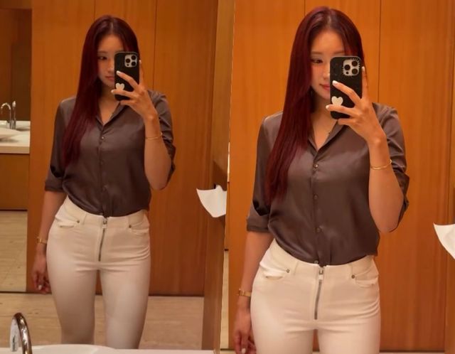 공개된 사진 속 유현주는 고급스러운 브라운빛 새틴 셔츠에 하이웨이스트 화이트 팬츠를 매치해 세련되면서도 시크한 스타일링을 선보였다. 특히 허리라인을 강조하는 팬츠 핏과 자연스럽게 흐르는 셔츠 실루엣이 조화를 이루며 볼륨감 넘치는 바디라인을 완벽히 드러냈다. 긴 생머리와 단정한 메이크업이 절제된 고혹미를 배가시켰다.