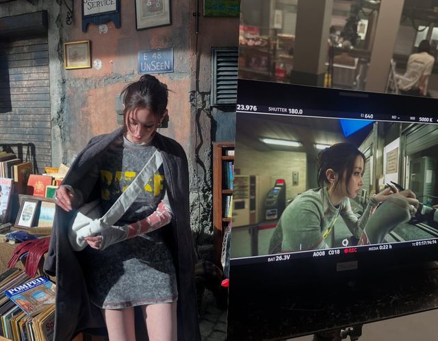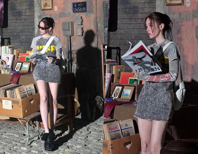 공개된 사진 속 그는 회색 워싱 미니드레스에 팔 부상으로 착용한 슬링을 더한 독특한 스타일링으로 시선을 사로잡았다. 캐주얼한 티셔츠와 빈티지한 북 배경, 그리고 선글라스까지 더해져 강렬한 스트리트 무드가 완성됐다.