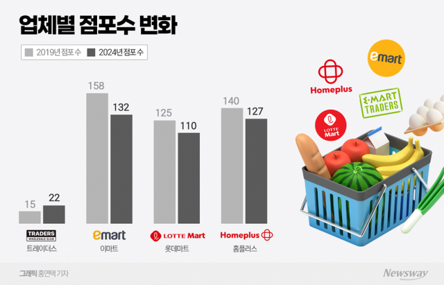 대표적인 사례가 이마트의 창고형 할인점 '트레이더스'다. 2018년 약 1조 원대였던 연매출은 2019년 2조 원을 돌파했고, 2024년에는 3조5000억 원 수준까지 성장했다. 점포 수도 2019년 15개에서 2024년 22개로 확대됐다. 반면 전통 이마트 점포는 같은 기간 160개에서 132개로 줄었고, 롯데마트도 125개에서 110개로 축소됐다. 규제를 피해 상대적으로 자유로운 유통 포맷으로 무게 중심을 옮기고 있는 것이다.