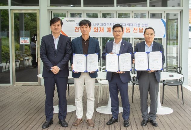 | ▲ , (주)SG E·C, ㈜휴트로에서 청라제일풍경채 2차아파트 전기차 화재 예방 위한 안전물품 전달식 |