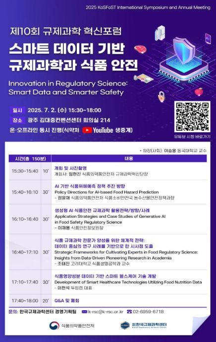 [와이뉴스] 식품의약품안전처는 한국규제과학센터와 함께 ‘스마트 데이터 기반 규제과학과 식품 안전’을 주제로 하는 ‘제10회 규제과학 혁신포럼’을 7월 2일 광주 김대중컨벤션센터(광주광역시 서구 소재)에서 개최한다.