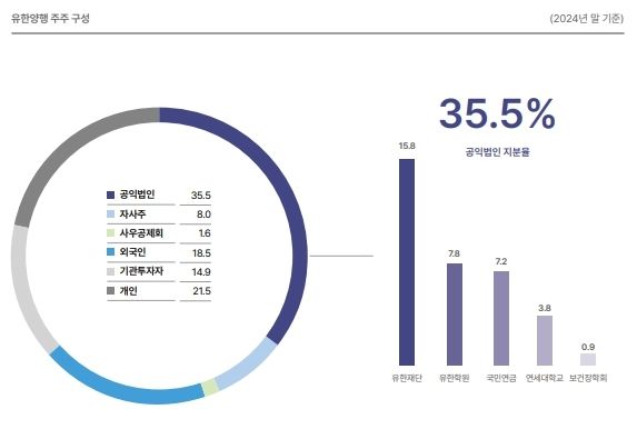 지난해 말 기준 유한양행의 자사주 비율은 전체 주식의 8%다. 나머지 주주구성은 유한재단 35.5%, 외국인 18.5%, 기관투자자 14.9%, 개인 21.5%, 사우공제회 1.6% 등이다.