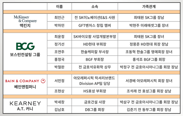 국내 재계 인사 중에서도 글로벌 컨설팅 업체 출신이 상당수다. 최인근 씨의 누나인 최윤정 SK바이오팜 사업개발본부장도 베인앤컴퍼니에서 컨설턴트로 2년간 근무했다. 이외에도 △정기선 HD현대 부회장 △조연주 한솔케미칼 부회장 △홍정국 BGF 부사장 △조현성 HS효성 부회장 △서민정 아모레퍼시픽 럭셔리브랜드 Division AP팀 담당 등 다수의 재계 인사가 글로벌 컨설팅 업체를 거쳤다. 승계와 무관하게 김범석 쿠팡 의장, 김슬아 컬리 대표 등 스타트업 성공 신화를 쓴 리더들도 컨설팅 회사 출신이다.