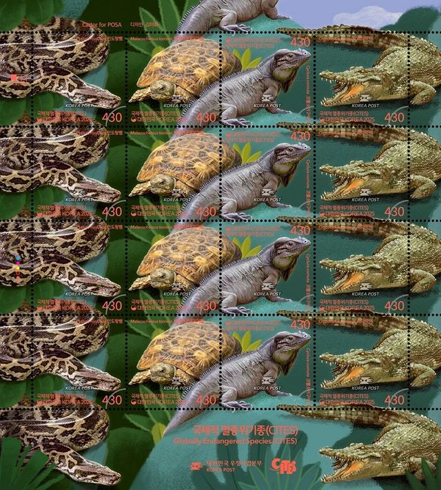 이번 우표에는 △인도왕뱀 △팬케이크육지거북 △코뿔소이구아나 △바다악어 등 국제적으로 멸종 위기에 처한 야생동물의 모습이 담겼다.