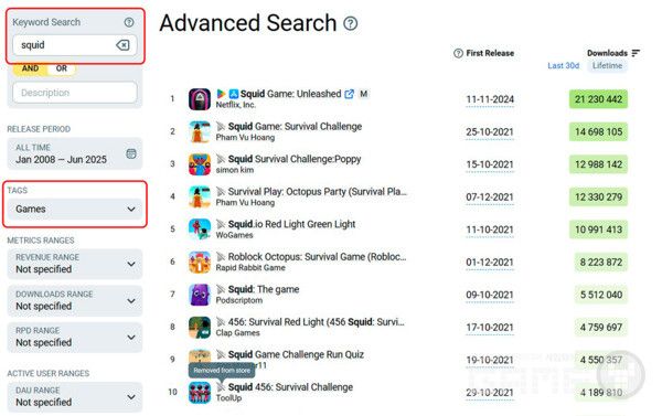 잘 실행된다면, 오징어 게임 같은 주류 미디어를 활용하는 것은 스튜디오가 트랙션을 얻고 즉각적인 성장을 이끌어내는 저위험, 고수익 전술이다. 고급 검색으로 'squid' 타이틀 상위 10개를 살펴보면, 단 하나만이 여전히 살아남아 있다. 하지만 나머지 여러 타이틀은 사라지기 전에 400만에서 1,400만 설치 수를 기록했다.