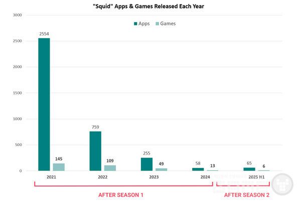 우리의 고급 검색 도구는 2021년에 'squid' 키워드를 사용한 2,554개의 앱이 출시되었으며, 이 중 145개가 게임이었다는 것을 추적했다. 하지만 모든 트렌드와 마찬가지로, 열기는 서서히 식었다. 올해, 드라마의 최종 시즌 직전에 'squid' 앱은 단 65개만 출시되었다. 여전히 많은 숫자지만, 예전의 열풍과는 비교할 수 없다.