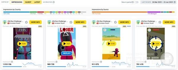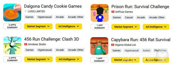 ASO만 트렌드 미디어가 힘을 발휘하는 곳은 아니다. 광고 인텔리전스를 통해 우리는 오징어 게임의 비주얼 참조나 오해를 불러일으키는 크리에이티브를 사용한 수백 개의 광고를 추적했다. 이는 상대적으로 적은 노력으로 빠르게 제작되며, 제대로 실행하면 빠르게 보상을 얻는다.